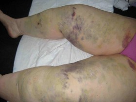 Die Beine sind stark angeschwollen, färben sich jeden Tag etwas mehr. Meine Physiotherapeutin, eigentlich hart im nehmen, hatte heute bei der Lymphdrainage doch mal kurzzeitig ein flaues Gefühl im Magen als sie meine Beine sah. Mich schockt es nicht, hatte vorher schon mal Bilder gesehen, die nach einer Liposuktion aufgenommen wurden.